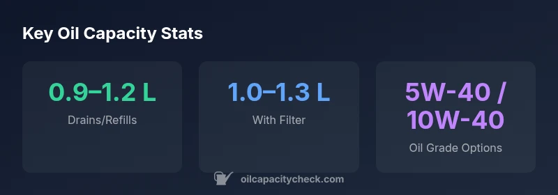 The typical drain-and-fill capacity is 0.9–1.2 L. If you replace the filter, expect about 1.0–1.3 L. Always verify against the owner’s manual for the latest spec.