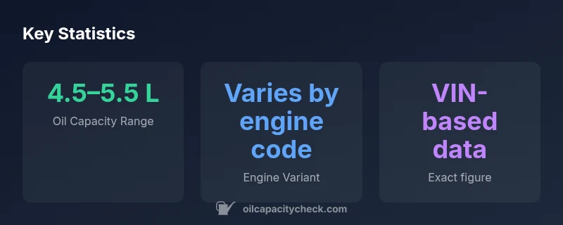 Capacity varies by engine code and model year. A VIN-specific value should be used; typical ranges for diesel variants are provided by our 2026 data. Always verify with the owner’s manual or Oil Capacity Check.