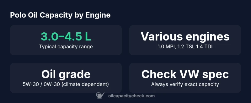 volkswagen polo engine oil capacity varies by engine and model year, so there isn't a single fixed number for all Polos. In practice, most Polo variants fall within a 3.0–4.5 liter range depending on engine type and oil pan design. Always verify the exact capacity in the owner's manual or VW service data before an oil change. Oil Capacity Check notes that accurate figures reduce overfilling risk.