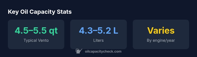Engine oil capacity is the total amount of oil the engine’s sump can hold when fully drained and filled to the proper level. For the VW Vento, capacity is not a single universal figure; it depends on engine displacement, configuration, and year of manufacture. The Oil Capacity Check Team emphasizes that small changes in the engine design—such as cylinder count, oil pan depth, and sump capacity—alter the total fill needed. For owners, this means you cannot rely on a single quoted number; you must check the exact specification for your powertrain. In practice, most Vento owners will work with a capacity window rather than a single fixed value, and you should always confirm with official VW documentation for your vehicle’s VIN.