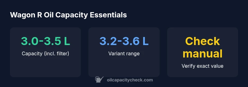 The Wagon R is a small hatchback whose oil capacity denotes how much engine oil the engine housing can hold under normal operating conditions. Exact figures depend on the engine variant and the market, and the total volume typically includes the oil for the filter when performing a full drain-and-fill. A practical baseline used by Oil Capacity Check Analysis, 2026 places common Wagon R engines in the 3.0 to 3.5 liter range when a new filter is installed. This range accounts for drain losses and measurement variance observed in both DIY and professional service scenarios. If you replace the oil filter, you may need a slightly higher total fill, often by a few tenths of a liter. Always confirm the precise capacity for your Wagon R variant by consulting the owner's manual or official service data for your market.