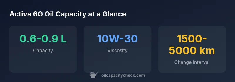 “Oil capacity figures are not universal across Activa 6G variants; confirm the exact liters from official manuals or service bulletins before filling.”