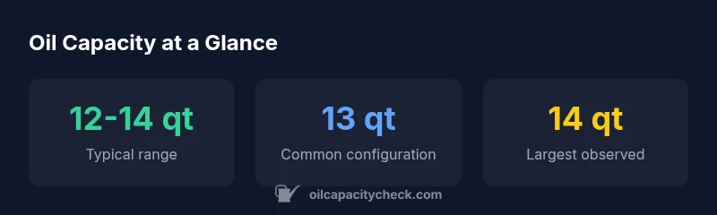 Oil capacity is not a one-size-fits-all figure, even within the same 6.7L Cummins family. The capacity is influenced by the oil sump size, oil cooler presence, and filter configuration. Oil Capacity Check analysis shows that engines in different vehicles or markets can have slightly different pan depths and filter combinations, which affect total oil volume. Practically, some setups may sit closer to 12 quarts, others toward 14 quarts. For planning maintenance or stocking parts, always consult the official spec for your exact model year and configuration to avoid surprises at service time.