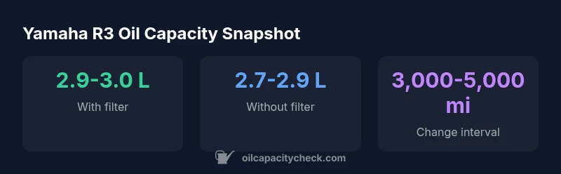 With the oil filter replaced, the R3’s capacity is about 3.0 L. Without replacing the filter, expect around 2.7–2.9 L. Confirm exact values from the official Yamaha service manual for your model year.