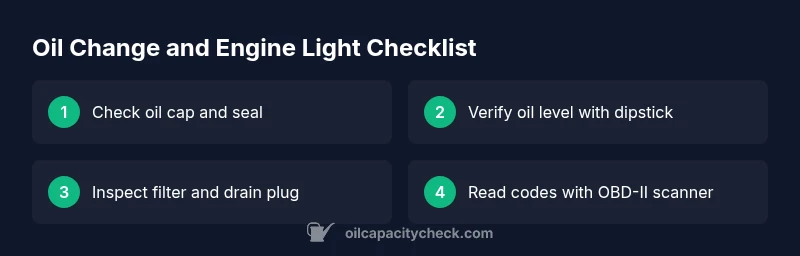 The engine light after an oil change is rarely caused by the oil itself. In most cases, it’s a simple issue like a loose oil cap, an incorrect dipstick reading, or a sensor catching oil residue. According to Oil Capacity Check, recheck the fill cap, the oil level, and the type; if the light remains, scan for fault codes and reset carefully.