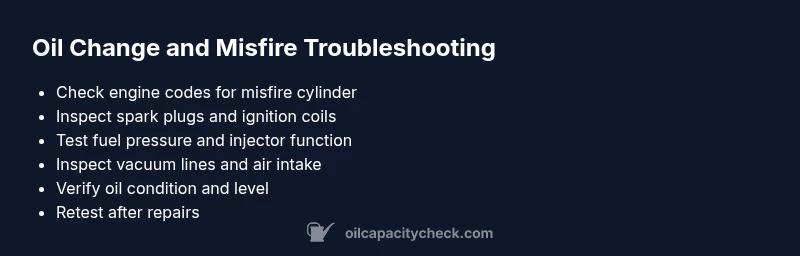 Discover whether an oil change can fix engine misfires, why it usually cannot, and the step-by-step diagnostic path to identify ignition, fuel, and compression issues. Practical tips from Oil Capacity Check.