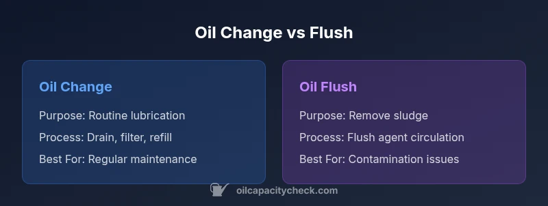 Two common maintenance terms often confuse drivers: the difference between oil change and flush. In short, an oil change replaces used engine oil and the filter, restoring lubrication, while an oil flush cleans the passages to remove sludge and deposits. The choice hinges on engine condition, manufacturer guidance, and service history. According to Oil Capacity Check, understanding these concepts helps owners decide when action is needed.