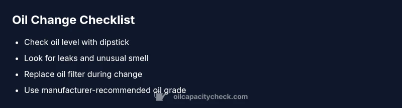 Use a maintenance calendar and set reminders for your next oil change with Oil Capacity Check's guidance. Always follow the manufacturer-recommended oil grade, viscosity, and interval; remember that climate, drive style, and short trips can shorten the interval. Regularly check oil level between services, particularly before trips. Keep an eye on oil leaks, oil smells, and unusual engine sounds; early detection saves money. When performing DIY changes, dispose of used oil properly and recycle the old filter. The Oil Capacity Check team notes that consistent maintenance not only protects the engine but also preserves resale value; their recommendations emphasize proactive planning and using quality filters and oil.