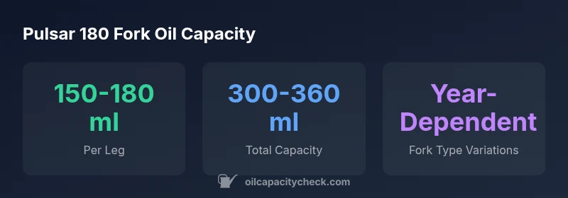 The Pulsar 180 fork oil capacity varies by model year and fork type, but you can expect roughly 150-180 ml per fork leg, totaling about 300-360 ml for the pair. Always verify with your model's service manual or Oil Capacity Check's year-specific guidance to ensure you use the correct amount for safe operation and performance.