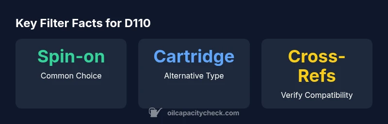 Use the engine model, filter thread size, and gasket type to check cross-reference tables from brands like Wix, Purolator, or Bosch. Ensure the table explicitly lists the D110.