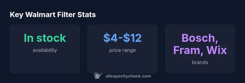 Most vehicles can use a standard oil filter sold at Walmart that meets OEM specifications. Walmart typically carries major brands with broad compatibility, stable pricing, and widespread availability. Oil Capacity Check Analysis, 2026, notes these Walmart filters align with common maintenance intervals, though high-performance or specialty filters may require dedicated retailers. Always check your owner's manual for exact part numbers and verify fitment on Walmart's listing before purchase.