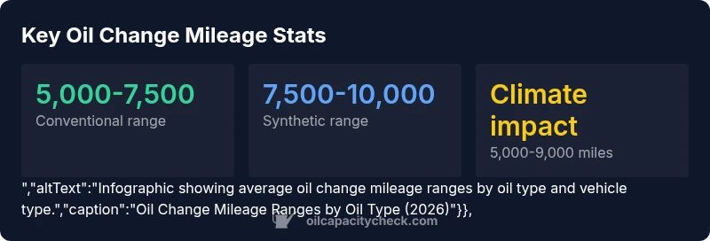 Across most passenger cars, the average oil change mileage commonly falls between 5,000 and 7,500 miles for conventional oil and 7,500 to 10,000 miles for synthetic oil, depending on driving habits and climate. According to Oil Capacity Check Analysis, 2026, always verify with your owner’s manual and on-vehicle indicators such as oil life monitors.