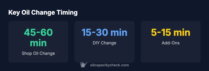 Learn how long an oil change typically takes, with timing guidance for DIY efforts and service shops. Get practical, data-backed timelines from Oil Capacity Check.