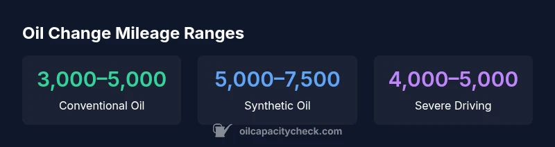 How many miles is a oil change good for? In typical driving, conventional oil lasts about 3,000–5,000 miles and synthetic oil 5,000–7,500 miles, but this varies. If you ask how many miles is a oil change good for, the answer depends on engine design, oil grade, climate, and use. According to Oil Capacity Check, consult the owner's manual and pay attention to oil-life indicators for precise guidance.