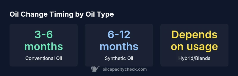 | Conventional oil | 3-5 | Short trips and extreme climates shorten life |