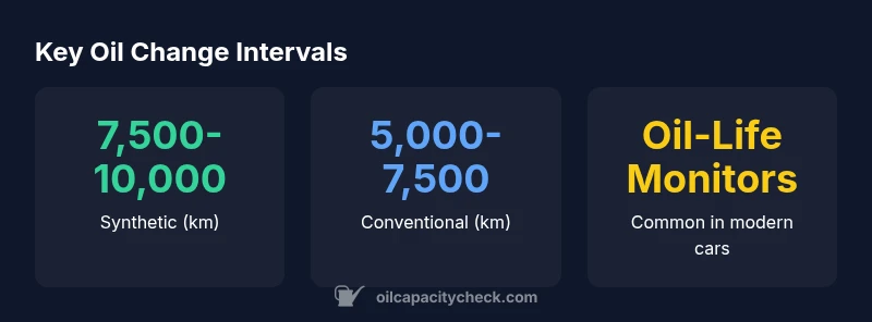 Typically, oil change after how many kilometers depends on oil type and driving. Common ranges are 7,500–10,000 km for synthetic oil and 5,000–7,500 km for conventional oil. If your vehicle has an oil-life monitor, it can extend or shorten this based on real driving, with some models reaching 12,000–15,000 km under ideal conditions. Always verify with your owner's manual and monitor readings.