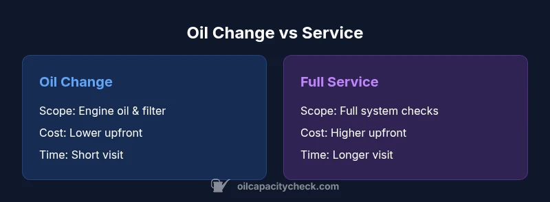 According to Oil Capacity Check, deciding between an oil change or service hinges on your car’s age, mileage, and maintenance history. An oil change replaces the engine oil and filter, while a service visit spans broader checks like fluids, belts, brakes, and air filters. Understanding these differences helps you plan maintenance and budget effectively.