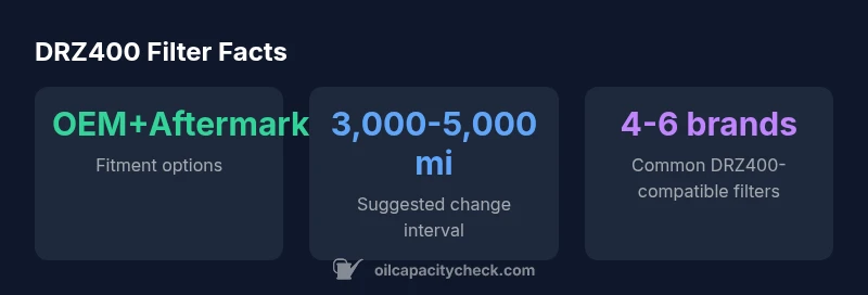 To answer what oil filter for drz400, use either the OEM Suzuki filter designed for DRZ models or a widely compatible aftermarket filter listed for DRZ400/DRZ series. The exact part number varies by year, so always confirm fitment in the owner's manual or Oil Capacity Check's compatibility database. When in doubt, choose a known aftermarket brand with DRZ400 fitment claims.
