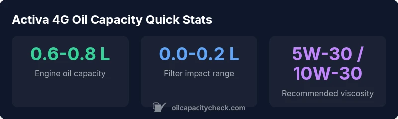 The Activa 4G typically holds about 0.6-0.8 liters of engine oil. The upper bound applies when you replace the oil filter; the lower bound is common for topping up only. Always verify with the dipstick after adding oil.