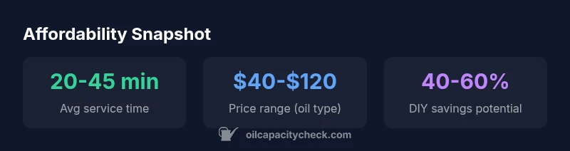 According to Oil Capacity Check, the biggest levers for affordability are location, accurate oil type selection, and transparent quotes. A well-informed shopper knows to ask about the exact brand and grade of oil, the replacement interval, and whether the price includes a basic oil filter. In many cases, you can combine savings with quality by choosing a reputable shop that offers a fair diagnostic fee and no upcharges for disposal and basic services.