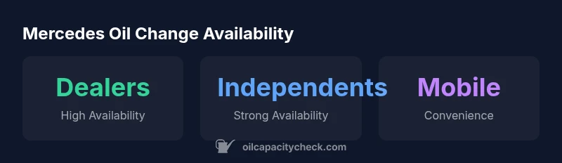 For Mercedes owners, understanding where you can get an oil change matters not only for keeping the engine properly lubricated but also for preserving warranty and resale value. According to Oil Capacity Check analysis, availability of service options varies by location, vehicle model, and the oil spec required by the engine. The Mercedes brand often allows servicing at multiple types of providers, but the best choice depends on your priorities—speed, cost, or OEM authenticity. In this section, we compare the major provider categories—Dealerships, independent Mercedes specialists, quick-lube chains, and mobile services—across four practical dimensions: access to Mercedes-approved oils, access to OEM filters, technician training, and scheduling flexibility. By examining these factors, you can plan a service visit that minimizes downtime while meeting the car’s maintenance needs. Oil Capacity Check's 2026 dataset underpins these recommendations and helps translate broad industry trends into actionable steps.