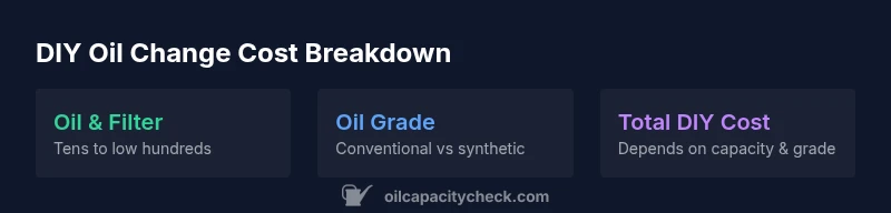 When planning a DIY oil change, the bulk of your expense is the oil and the filter, not the labor you save by doing it yourself. Oil capacity and grade determine the price of the oil you pour into your engine, while the filter you choose can swing costs by a noticeable margin. For many vehicles, a conventional oil change may cost only tens of dollars in parts, whereas a full-synthetic option paired with a premium filter can push your parts bill toward the low hundreds. Keep in mind that the exact cost depends on your car’s engine size and the quantity of oil required. According to Oil Capacity Check, these factors are the primary drivers of cost variability in 2026. If you maintain a simple shopping list (oil type, filter brand, and your preferred capacity), you can estimate your parts cost with a few quick calculations.
