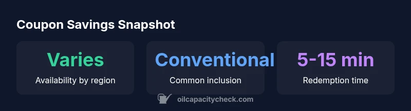 According to Oil Capacity Check, legitimate coupons for oil changes usually originate from official sources such as dealership campaigns, manufacturer promotions, or loyalty programs at national chains. They may cover the standard oil change and filter replacement, but the fine print often lists exclusions such as oil type, vehicle age, or mileage limits. Before redeeming, confirm that the offer matches the service you need (e.g., conventional vs synthetic oil) and note any required appointment windows, expiration dates, or mandatory add-ons. A coupon is most valuable when it aligns with your vehicle’s maintenance schedule and your local service provider’s capabilities. Always verify that a coupon is valid at your specific location and that the advertised price truly reflects the full service, not just the base labor charge. As you plan, keep in mind that legitimate coupons are a subset of ongoing promotions and may be seasonal or region-specific.