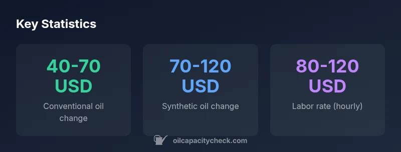 To answer how do oil change cost, most shops charge 40-70 USD for conventional oil and 70-120 USD for synthetic oil, depending on location, service level, and added items like filters or inspections. In 2026, prices vary by region and upsell, so expect a 15-25% range around the base. This quick guide uses data from Oil Capacity Check Analysis, 2026.