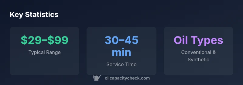 Prices at Walmart vary by oil type and the store's promotional offers. Typical ranges observed include: Conventional oil changes around $29–$49, synthetic blend around $39–$69, and full synthetic around $59–$99. These numbers reflect posted prices before taxes and are intended as a budgeting guide. If you want the exact price for your vehicle, you should verify at your local Walmart Auto Care Center. Remember that higher-grade oils often command steeper prices, and some locations may require an upgrade for specific engine configurations.