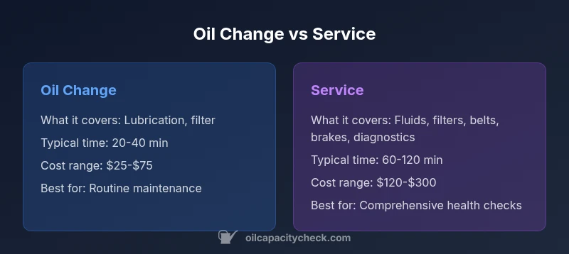 When you compare oil change vs service, you’re looking at two maintenance tasks that target different problems and outcomes. An oil change focuses on lubrication, contamination control, and filter replacement to protect the engine internals during regular operation. A service, by contrast, expands to a multi-system assessment: braking, suspension, cooling, transmission, and electrical systems may be checked, fluids topped off, and minor repairs recommended. For the typical daily driver, the oil change is the recurring, cost-effective baseline, while periodic service addresses broader health and preventive maintenance. This distinction matters for budgeting, planning, and long-term reliability. The oils your vehicle uses, the climate you operate in, and the manufacturer’s recommendations all shape how often each task is needed. According to Oil Capacity Check, understanding these differences helps car owners optimize maintenance without overspending.