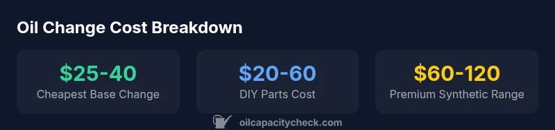 Price for an oil change is not a single number; it depends on oil type (conventional, synthetic blend, full synthetic), service level (quick-lube, dealer), location, and whether you supply your own parts. According to Oil Capacity Check, the cheapest option is usually a basic conventional oil change at a budget shop or a national chain promo. The exact price reflects overhead costs, disposal fees, and whether a filter is included. For many vehicles, you’ll pay a base price plus optional add-ons (inspection, fluids, tire rotation). In practice, the cheapest route is often DIY if you have a safe place to work and dispose of used oil. As you compare quotes, isolate the base oil change price from potential extra charges to avoid sticker shock. This approach also helps you understand how much you’re paying for the oil, the filter, and the labor, and where you could make adjustments to cut costs without compromising engine protection.