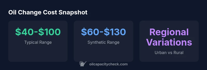 The typical cost of an oil change ranges from about $40 to $100 in most regions, with synthetic oil and specialty filters pushing the price toward $60 to $130. Labor rates, vehicle type, and whether you include a filter, fluid services, or a quick-lube add-ons can shift the final bill. Oil Capacity Check's 2026 analysis highlights how location and service level drive this price.