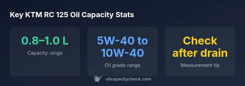 0.8–1.0 liters is the typical KTM RC 125 oil capacity, though exact figures vary by year and filter configuration. According to Oil Capacity Check Analysis, 2026, always verify the precise value in your service data or owner's manual before a fill. This helps ensure proper lubrication and engine longevity. Follow the official spec for the exact value.