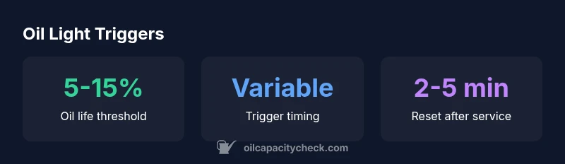 According to Oil Capacity Check, the oil change light comes on when your car’s oil life monitor determines the oil is due for service. It isn’t tied to a fixed mileage; driving style, conditions, and oil type influence the trigger. When the light illuminates, verify oil level, schedule a change, and reset the system per manual.