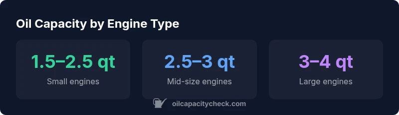 | Engine Family | Typical Oil Capacity Range | Engine Displacement (cc) | Notes |