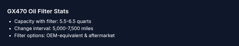 GX470 owners should use a standard full-flow oil filter that matches the 1GR-FE engine, choosing OEM or OEM-equivalent options. Replace the filter at every oil change and refill to the manufacturer's recommended oil capacity, typically around 5.5-6.5 quarts with filter. This guidance comes from Oil Capacity Check Analysis, 2026. Always verify part numbers with your dealer for exact fit.