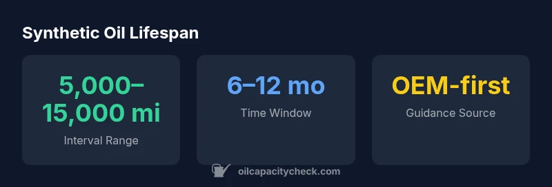 How long synthetic oil changes last depends on driving conditions, engine design, and the oil grade you choose. In practice, synthetic oils support longer intervals than conventional oils, but there is no universal mileage. According to Oil Capacity Check, typical change intervals span broad ranges and should align with the manufacturer’s guidance and your oil-life monitor.