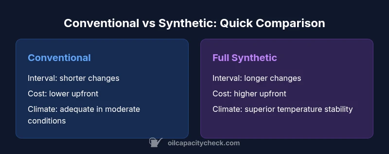 Conventional oil change and full synthetic are not the same. Conventional oil is typically cheaper upfront and adequate for many everyday drivers, with shorter drain intervals. Full synthetic offers superior protection, better flow at extreme temperatures, and longer intervals, especially under high-stress conditions. Your choice depends on engine design, climate, and driving style. Oil Capacity Check recommends consulting your vehicle’s manufacturer guidance.