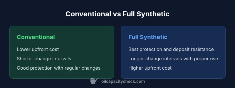 Full synthetic typically provides superior protection and longer intervals; conventional is viable for budget-minded or low-mileage scenarios.